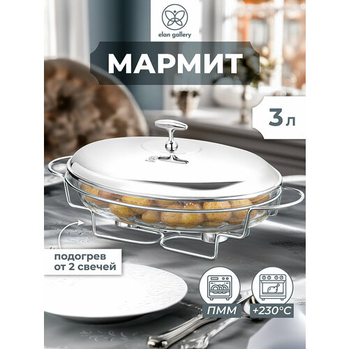 Овальный мармит от бренда Elan Gallery – это элегантное решение для подачи тёплых блюд на стол. Общий размер комплекта – 43,5х24,5х19 см, объём жаропрочной ёмкости – 3 литра. Красивая сервировочная посуда сочетает в себе функциональность и изысканный дизайн: снизу ёмкость подогревается двумя свечами (поставляются в комплекте), чтобы поддерживать температуру пищи. В набор входят: форма из жаропрочного стекла 34,8х23,8х6,5 см (внутренний размер блюда 28х18 см), крышка с изящной ручкой из нержавеющей стали 35х24,5х8,5 см, металлическая подставка 43,5х24,5х9,5 см (внутренний размер 34,5х23,5х8,5 см) и 2 свечи. Внутренний диаметр каждой подставки для свечи – 4 см. Круглые формочки для свечей с подставки не снимаются. Подставка из нержавеющей стали устойчива и легко сочетается с любым стилем столовой или кухни. Подогрев с помощью свечи создает мягкое, равномерное тепло – идеально для подачи шашлыка, горячих закусок или гарниров на фуршете. Прозрачные стенки подчёркивают аппетитный вид блюд, презентуя их для семьи и гостей. Используйте для красивой сервировки вторых блюд: рыбы, мяса или запечённого картофеля со сметаной и зеленью. Мармитница – это стильный кухонный инвентарь как для повседневного использования, так и праздничного стола. Не рекомендуется применять абразивные моющие средства. Можно использовать в роли формы для запекания в духовой печи при температуре 230 градусов (в том числе вместе с крышкой). Можно мыть в посудомоечной машине. Без крышки и подставки стеклянную тарелку можно использовать в микроволновой печи. Поставляется в стильной картонной коробке. Благодаря красивой коробочке не понадобится подарочная упаковка, если вы решите сделать подарок на праздник. В коллекции бренда Элан Галерея представлены товары для дома и стильная посуда, выберите вариант на свой вкус!