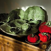 Капуста более ста лет является стимулом для творчества и источником вдохновения керамистов знаменитой фабрики Bordallo Pinheiro. Этот мотив, используемый португальскими мастерами с момента основания фабрики, поначалу был знаком уважения к бедным слоям населения и вызовом богачам. Но со временем осталась лишь художественная ценность символа, за много десятилетий доведенная до совершенства. Блюда, тарелки, менажницы, супницы, тортовницы – великолепный выбор различных предметов сервировки, сделанных в виде капустного листа. Это не просто посуда, а скульптурные и художественные произведения, тонко передающие все тонкости оригинала, созданного природой. Изумительное блюдо выполнено в стиле майолика – очень старинной технике производства керамики. Она представляет собой процесс, при котором глиняная основа, созданная мастером, покрывается глазурью с высоким содержанием свинца, а после подвергается обжигу. Сложность же объясняется тем, что во время выполнения росписи, краски впитываются мгновенно и поправить что-либо невозможно. Посуда Bordallo не только красива, но и качественна, она привнесет в ваш интерьер неповторимое очарование стиля кантри. За ней легко ухаживать и даже с годами ее блеск и яркость не утрачивают актуальность. Она ценится своей стойкостью к температурам и ее можно мыть в посудомоечной машине.