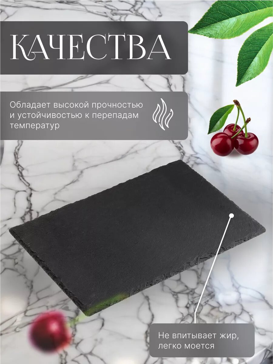 --- Технические характеристики: Материал: сланец Размер: 30х20 см Назначение: для сервировки стола --- Преимущества: - Высокая прочность - Устойчивость к перепадам температур - Не впитывает жир, легко моется - Экологически чистый, безопасный для здоровья материал - Не рекомендуется мыть в посудомоечной машине