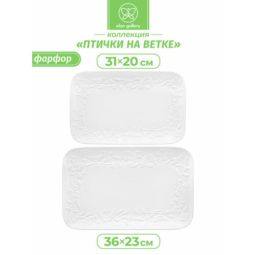 Набор 2 прямоугольных блюд Elan Gallery "Птички на ветке" выполнен из белого фарфора в классическом дизайне. В комплект входят тарелки размерами 31х20,5х2,5 см и 36х23х3 см. Каждая тарелочка подойдет для подачи рыбных, мясных блюд и закусок. Можно использовать для сервировки нарезки, овощей или фруктов для угощения большого количества гостей. Посуда серии украшена рельефным узором в виде фигурок птиц на изящных веточках. Эргономичная форма тарелки позволит использовать её как поднос. Удобно разместить на сервировочном блюде кусочки торта, пирога и другие сладости. Подойдёт для эстетичной подачи суши, роллов и бутербродов. Фарфоровая посуда отличается от керамической повышенной плотностью. Фарфор не впитывает цвет продуктов и не деформируется от влаги, чему может быть подвержена керамика. Избегать резких перепадов температур и беречь от механических повреждений. Не рекомендуется применять абразивные моющие средства. Можно использовать в микроволновой печи и мыть в посудомоечной машине. Поставляются в красочных картонных упаковках. Комплект станет отличным подарком для любой хозяйки, которая ценит стильную сервировку. Понравится любителям посуды в скандинавском стиле. Серия "Птички на ветке" позволит собрать сервиз в едином стиле и станет украшением вашего дома.