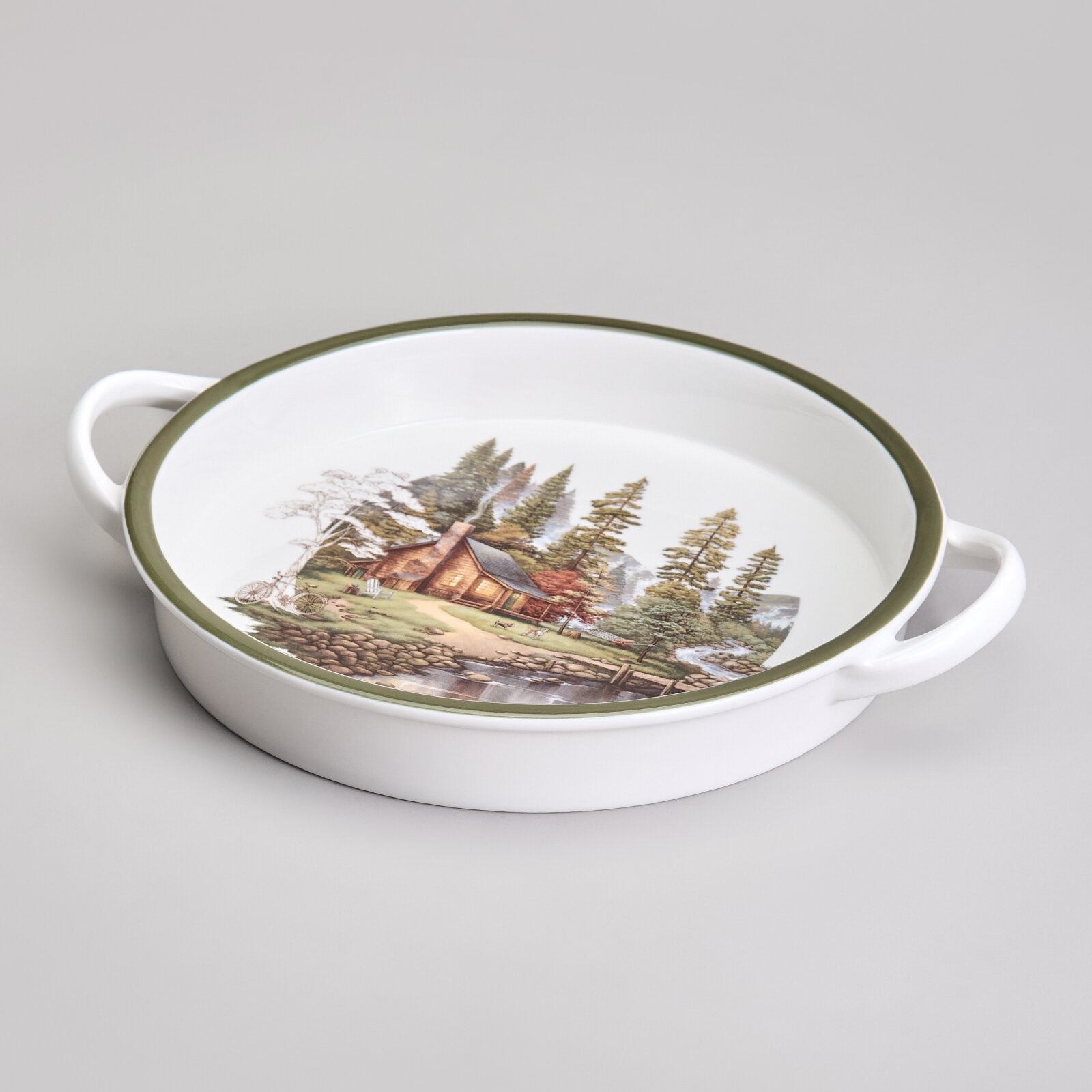 Круглое сервировочное блюдо с ручками выполнено из упрочнённого фарфора с толщиной стенок 6 мм. Эта круглая фарфоровая форма имеет общую длину 29 см, а её диаметр без учета ручек составляет 23.5 см, высота 3.5 см. Такое блюдо можно использовать в качестве салатника для сервировки и подачи салата, фруктов, закусок, нарезки и снеков для Ваших дорогих гостей. Кроме того, оно может служить блюдом для запекания. В нём прекрасно готовится мясо, овощи, рыба, десерты – любые Ваши кулинарные шедевры.