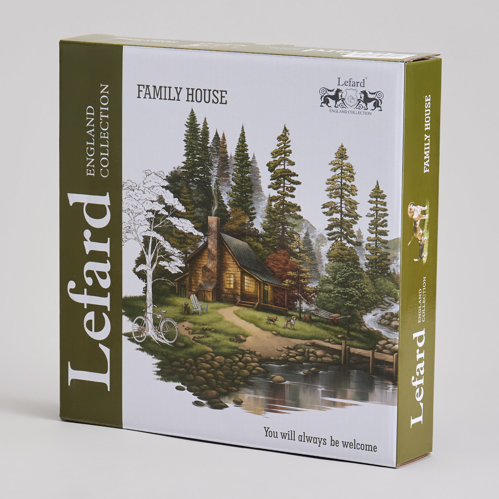 Коллекция Family House выполнена на качественном фарфоре с примесью оксидов алюминия, что придает этой посуде прочность и износоустойчивость. Декорации серии изображают тихие укромные уголки сельской местности. Высокие ели, горная речка, молчаливые запруды, поскрипывающая мельница, затихшая на отмели лодка, важные утки и покачивающийся гамак. А в центре этих зарисовок, конечно же, милый сердцу дом, струящийся дым из трубы, горящие теплым светом окна, и встречающие Вас дружелюбным вилянием хвостов пёсики.