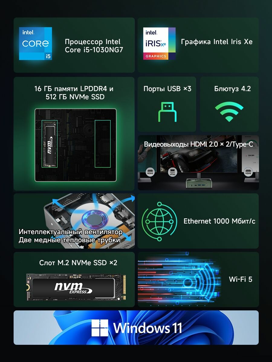 Мини ПК BMAX B6 PRO, Intel i5-1030NG7, RAM 16ГБ DDR5,512 ГБ SSD, Intel Iris plus Graphics, Type-C, Win11 Pro, зеленый: сравнение цен, характеристики, фото, актуальное наличие и цены.