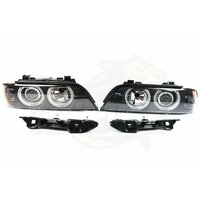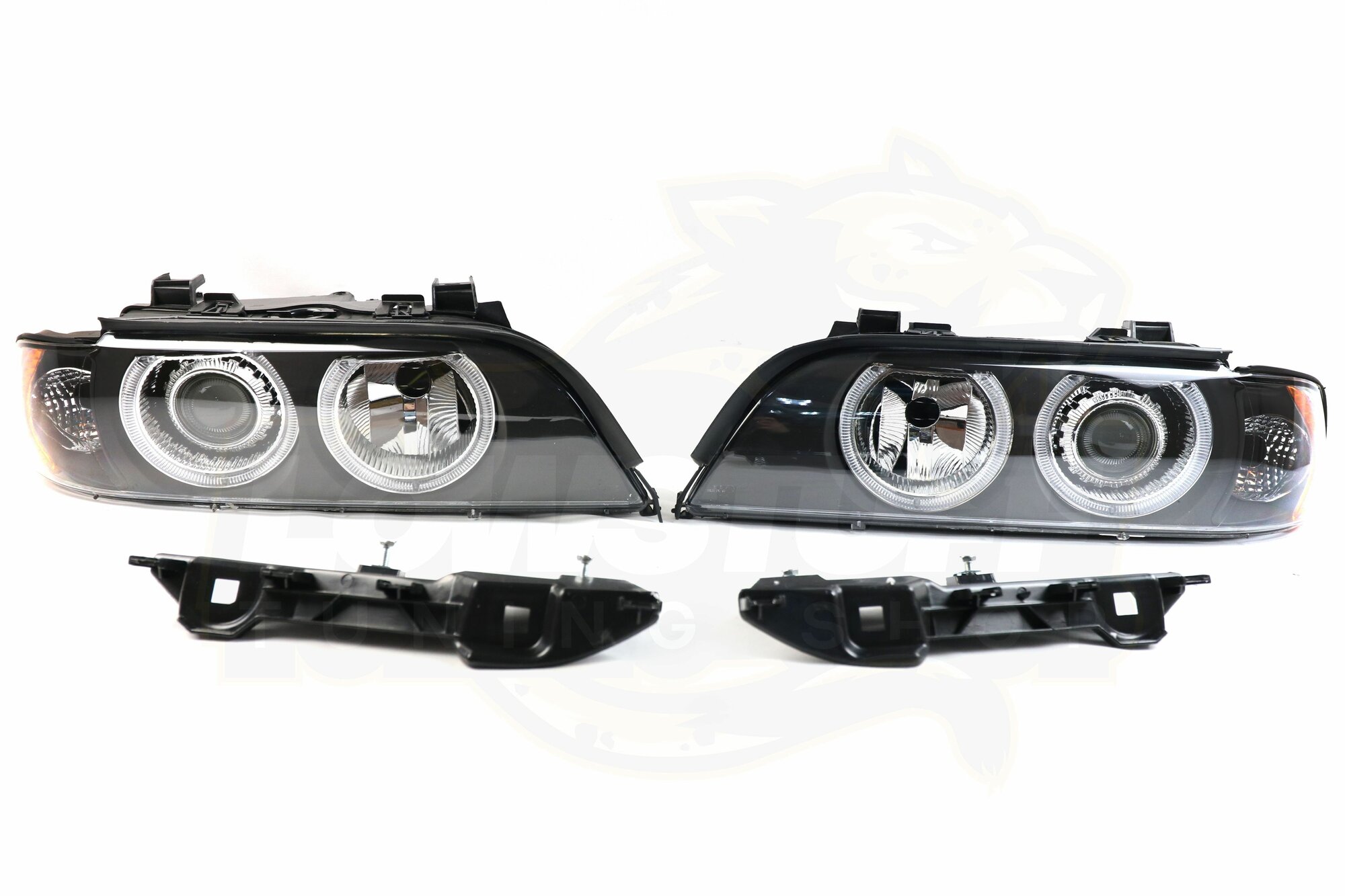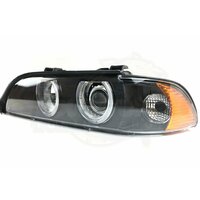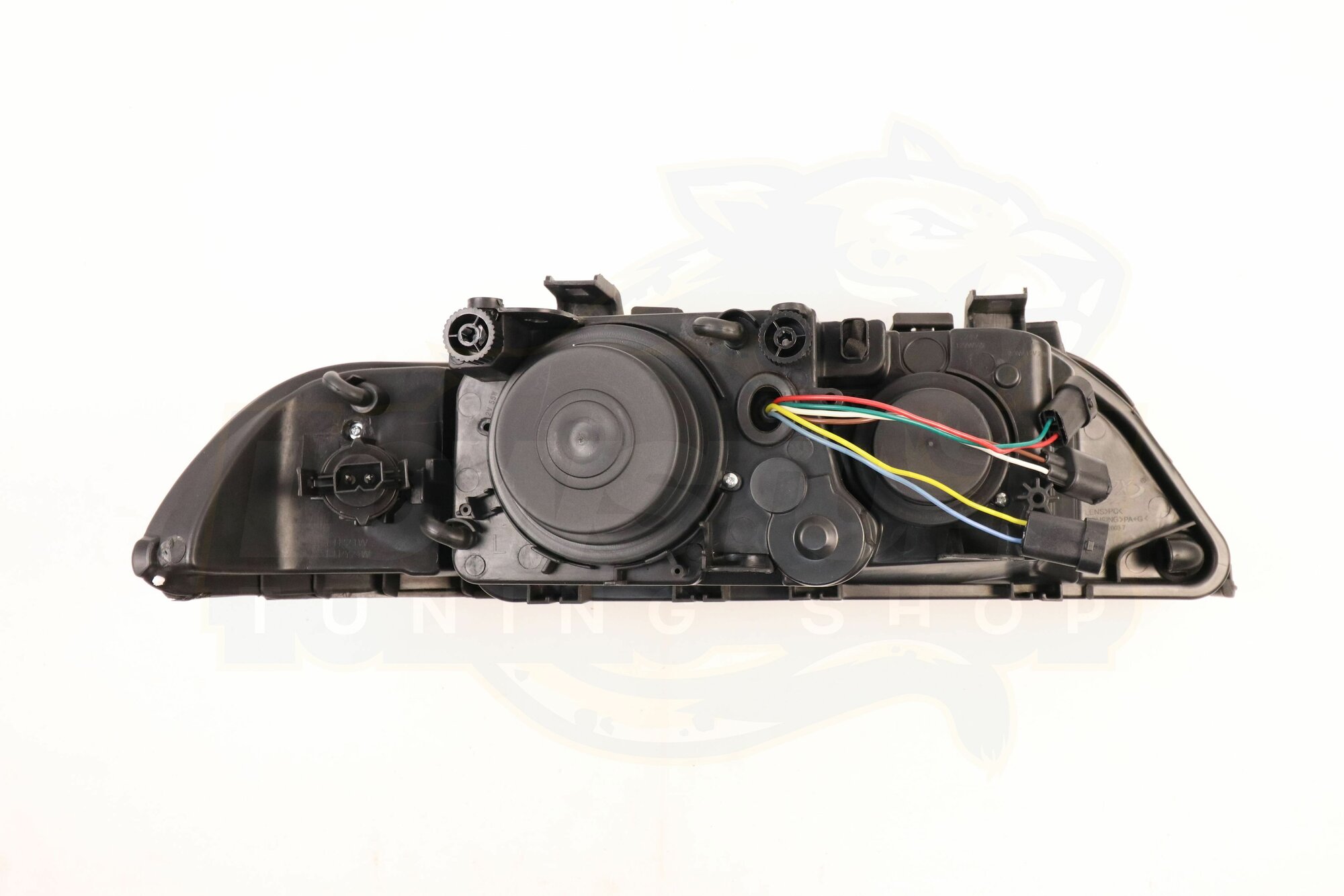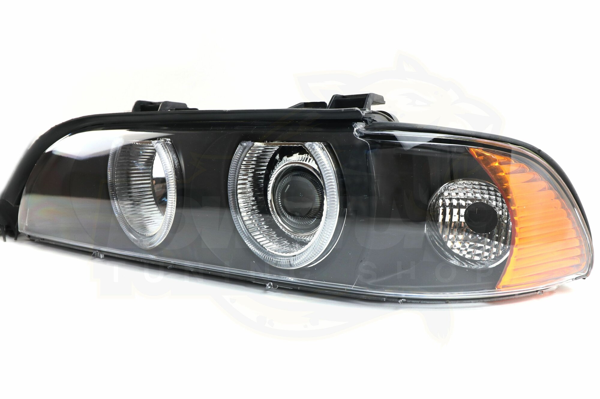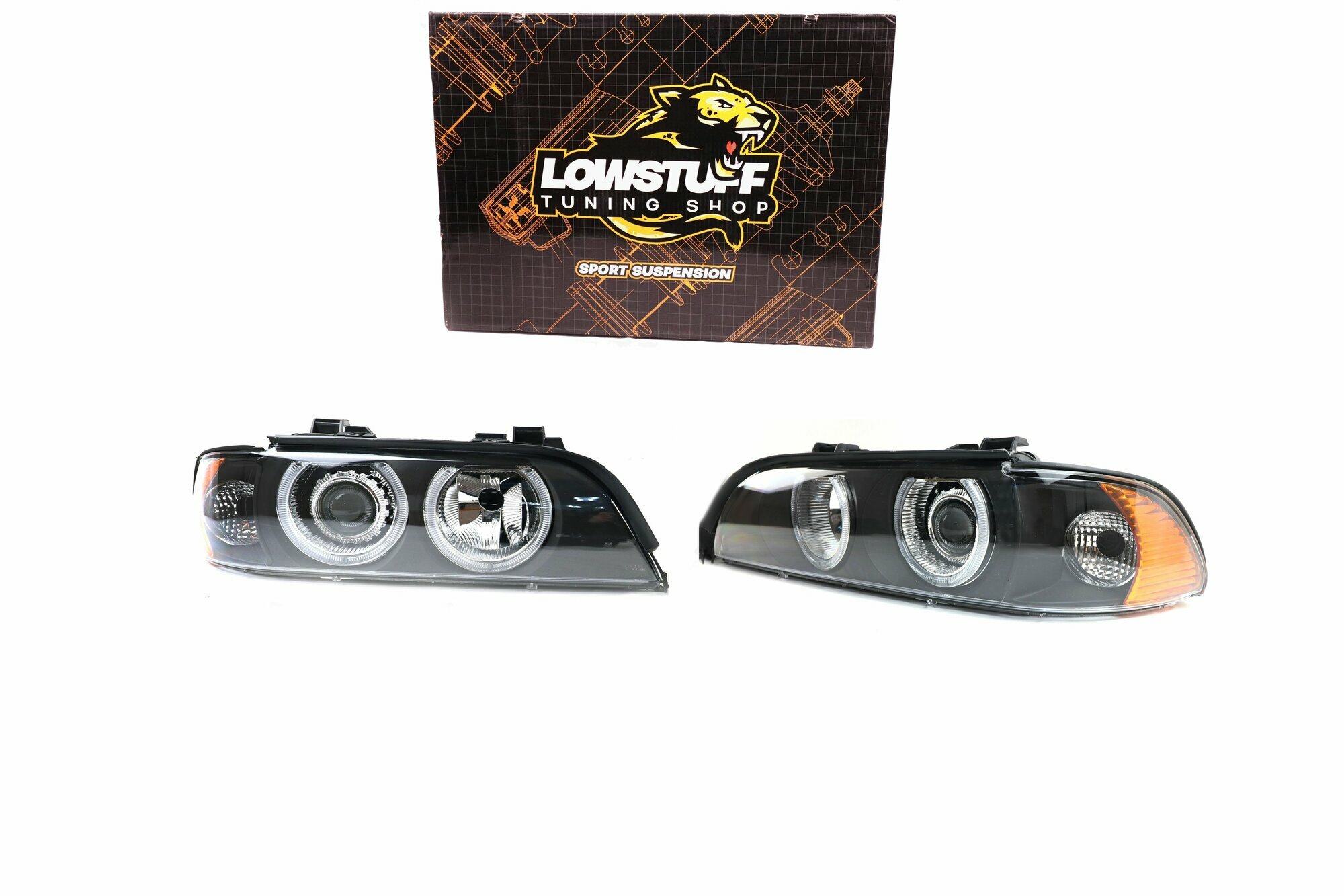 Передние фары головного света для BMW E39 дорестайл до 09.2000 года выпуска с ангельскими глазками белого цвета прозрачные стекла оранжевый поворотник