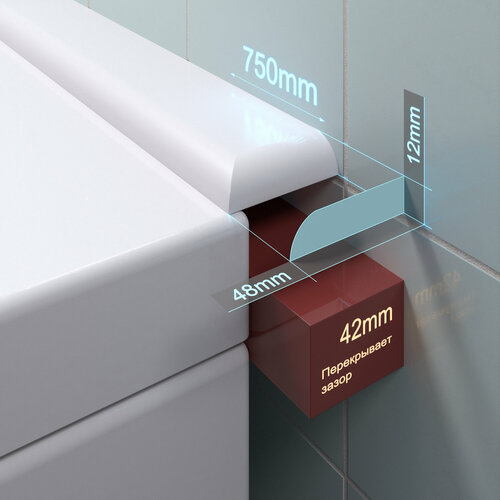 Ширины бордюра - 48 мм хватит, для того чтобы перекрыть зазор до 42 мм. Благодаря своим оптимальным размерам, он не только защитит от попадания воды в щели и предотвратит распространение плесени, но и хорошо скроет все мелкие недостатки.