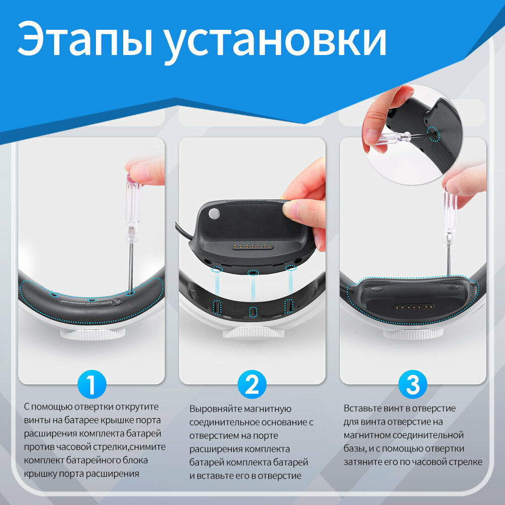 BOBOVR поддерживает инновации и высококачественное производство. Мы предоставляем до 18 месяцев послепродажного гарантийного обслуживания. Комплектация Зарядная док-станция - 1 шт. Аккумуляторная батарея - 1 шт. Зарядный кабель - 1 шт. Отвертка - 1 шт. Винты - 6 шт.