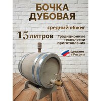 Средний обжиг – тонкая ваниль, цветочные ноты, спелые фрукты. Хороший обжиг для белых вин, которые часто обладают нейтральным ароматом. Дубовая бочка объемом 15 литров предназначена для выдержки вин, самогона и прочих алкогольных напитков. Она изготовлена из кавказского дуба скальных пород, который обеспечивает изделию долгое время эксплуатации, качественный процесс вызревания напитка и очень приятный эстетичный внешний вид. Последнее очень полезно, если вы приобретает бочку для подарка. При изготовлении дубовой бочки используется соединение клепки на микрошип. Обручи изготовлены из оцинкованной стали, это позволяет исключить окраса и, как результат, добиться экологичности дубовой бочки и исключить отслоения краски при эксплуатации