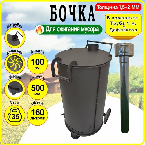 Купить Бочка для сжигания мусора Круглая 2 мм. — Большая с колосником, трубой и дефлектором. с доставкой по всей России. Бочка для сжигания мусора Круглая 2 мм. — Большая с колосником, трубой и дефлектором.: сравнение цен, характеристики, фото, актуальное наличие и цены.