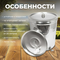 Пылезащитная крышка: Обеспечивает дополнительную защиту от загрязнений. Использовать эту железную емкость невероятно просто! Достаточно лишь надеть воздушную камеру на крышку, затем в особое отверстие вставить бродильный шпунт. Затем, подсоедините шланг от насоса к воздушной камере через переходник, опустите крышку на поверхность жидкости и накачайте камеру до 1 атмосферы. Для слива части напитка просто выпустите воздух из камеры перед открытием крана. Бочка Sansone из нержавеющей стали поможет Вам создавать великолепные домашние напитки, которые ничем не уступают лучшим образцам из магазина.