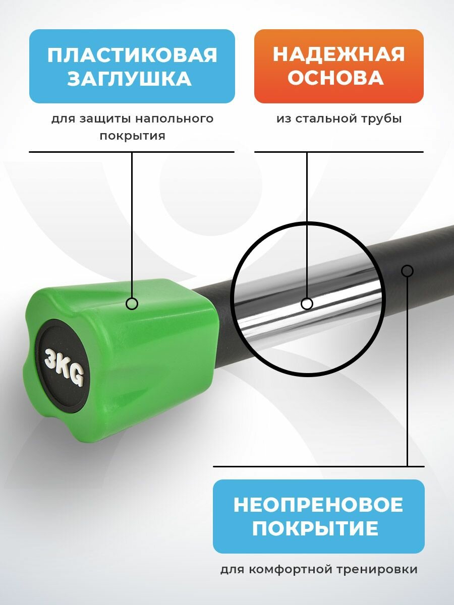 Бодибар неопреновый 3 кг или гимнастическая палка - это универсальный спортивный снаряд. Он эффективен для занятий фитнесом, аэробикой и других физических упражнений с утяжелениями в зале или дома. Выполнен в виде стальной трубки длиной 120 см с мягким неопреновым покрытием, на концах которой размещены резиновые накладки. Такая конструкция делает занятия с ним комфортными и безопасными, а еще защищает напольное покрытие от повреждений.