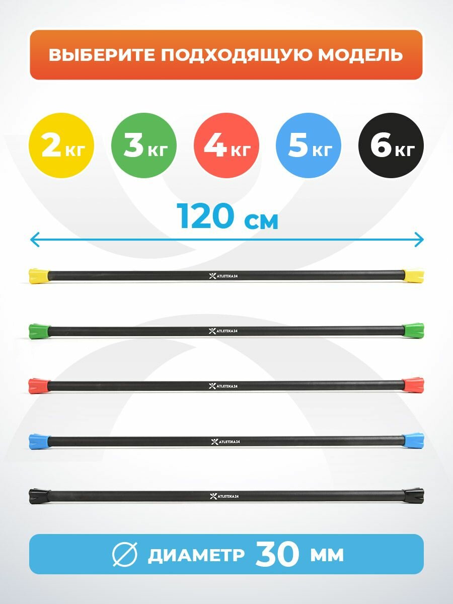В ассортименте у нас доступны гимнастические палки разного веса: 2, 3, 4, 5 и 6 кг. Благодаря этому вы легко сможете выбрать изделие с оптимальным для вас уровнем нагрузки. Также в каталоге представлен широкий выбор цветов: черный, синий, зеленый, красный, желтый.
