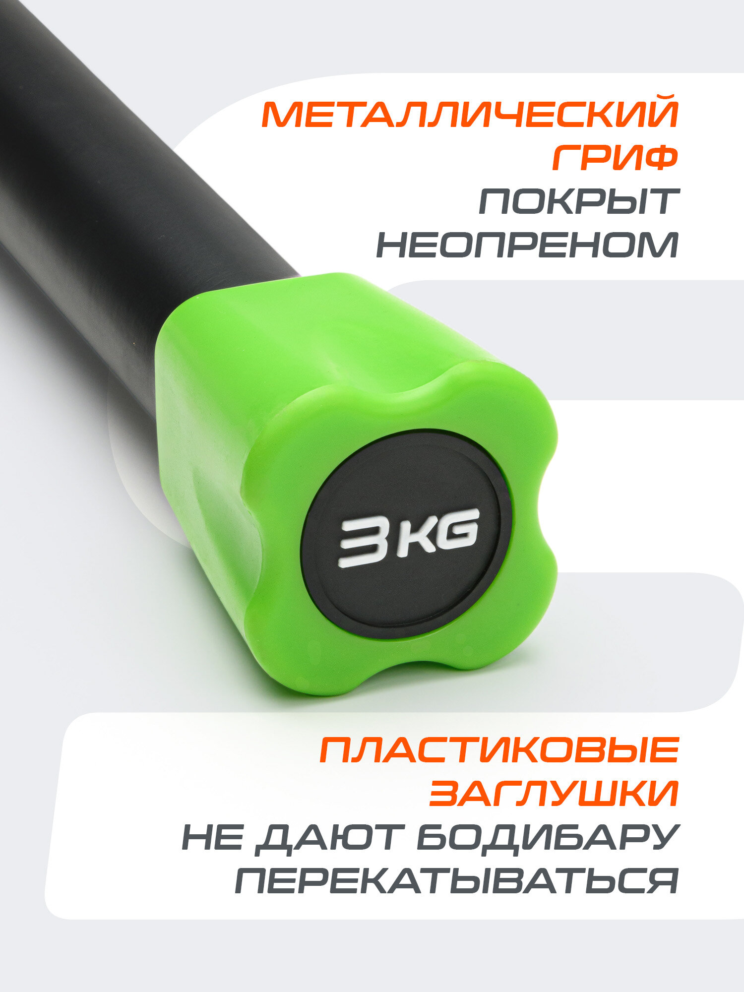 Бодибар BB-301 имеет покрытие из неопрена, приятное на ощупь, он не будет оставлять мозолей на ладонях и ссадин на спине и плечах. Специальная форма заглушек не позволит снарядам кататься по полу и пачкать неопреновое покрытие.