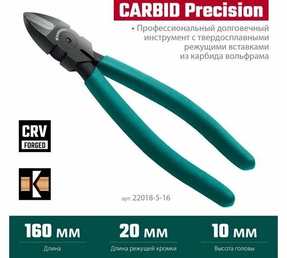 Бокорезы KarbMax 160мм KRAFTOOL выполнены из инструментальной стали высокого качества, что увеличивает срок службы. Они предназначены для работ с электроникой и механикой, требующих высокой точности. Удобные рукоятки надежно лежат в руках и не скользят. Благодаря шарнирному соединению получается добиться полного отсутствия люфта.