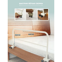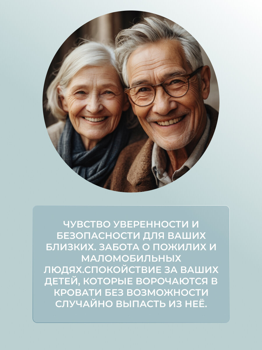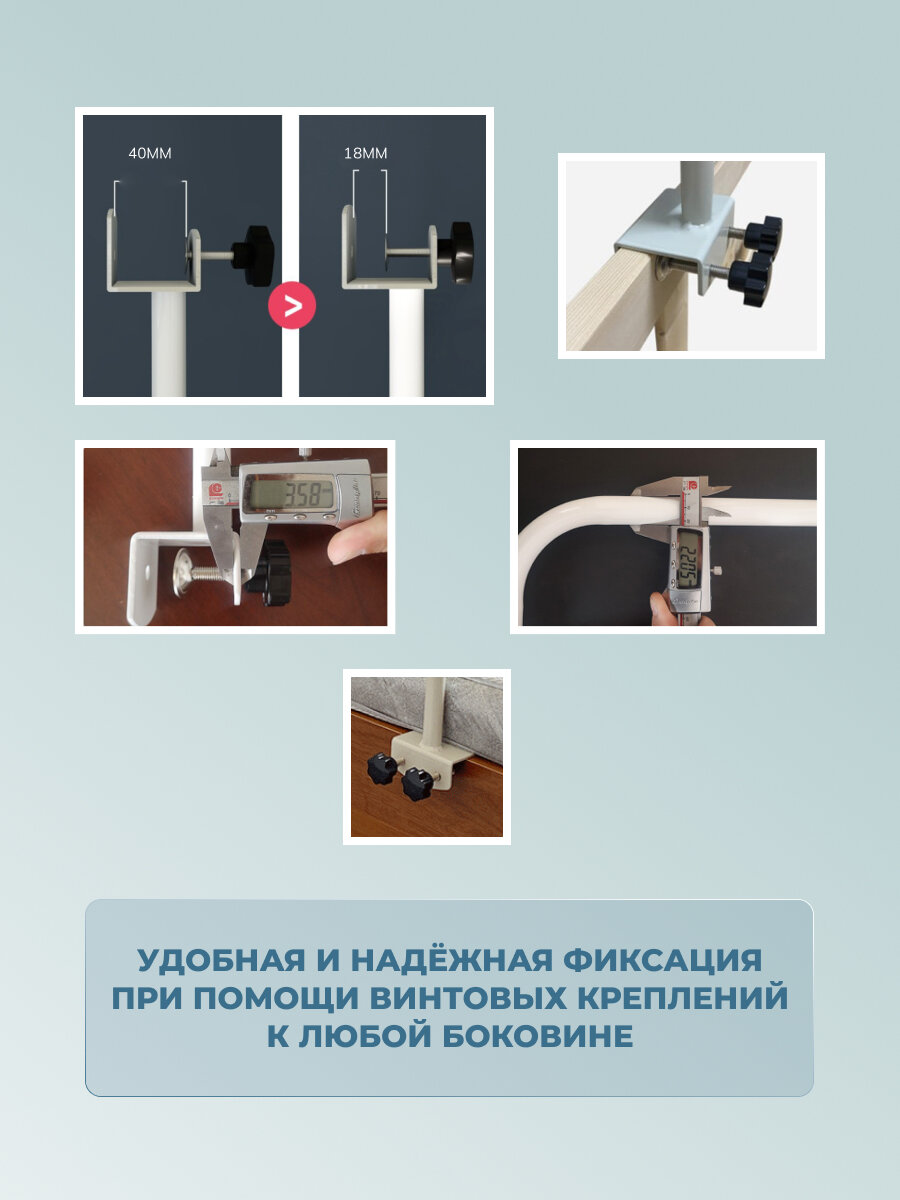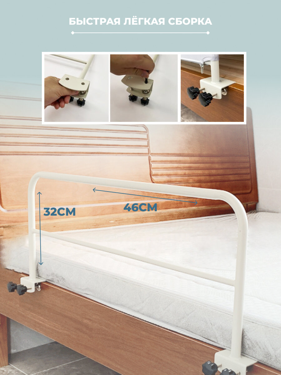 Съемное боковое ограждение, борт, мобильный поручень прикроватный для обычных бытовых кроватей, для взрослых и детей, простой в установке, сборке и разборке, подойдёт на подростковую и детскую кровать, для ширины борта кровати, царги 18 мм - 40 мм. Бортик безопасности для кровати, защита от падения с неё, без острых углов с закругленными краями, отличное решение, которое поможет обезопасить даже ребёнка от падения с кровати, защитный барьер, перила также послужит удобным средством поддержания равновесия и опоры для перемещения в кровати для людей с ограниченными возможностями. Металлическое ограждение, поручень на кровать, уберегает пожилых людей, инвалидов и лежачих больных от падения и помогает совершать самостоятельные движения – садиться, вставать, ложиться, изменять положение, устройство обеспечивает дополнительную поддержку для людей, имеющих нарушения функций опорно-двигательного аппарата и испытывающих трудности при вставании с кровати. Фиксируются к кровати наши железные перила при помощи четырёх закручивающихся винтовых креплений ( струбцина ). Габариты 46 см * 32 см.