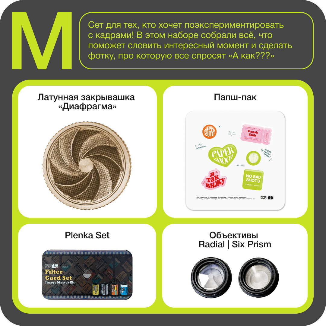 Состав: Plenka Set — 4 карточки, которые изменят базовые фильтры папша и сделают их более пленочными — наш и ваш любимчик; Объективы Fish eye | Star lens; Латунная закрывашка, которая надежно защитит объектив папша от царапин, пыли и прочего; Подарочная упаковка: коробка + открытка.