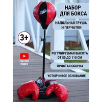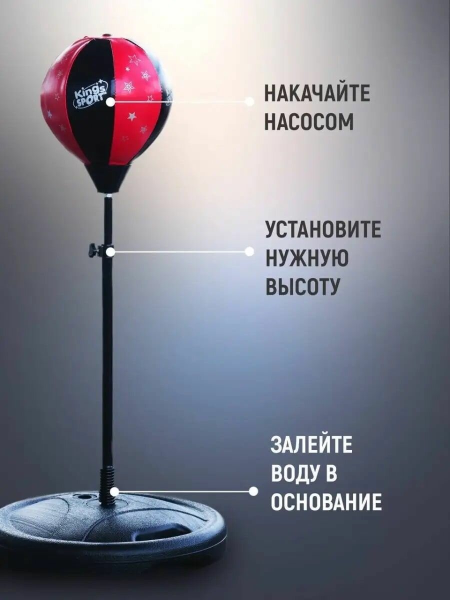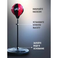 В наборе для бокса вы найдёте перчатки и регулируемую по росту грушу, которая накачивается при помощи насоса, а стойка наполняется песком или же водой. Насос не входит в комплект.