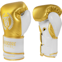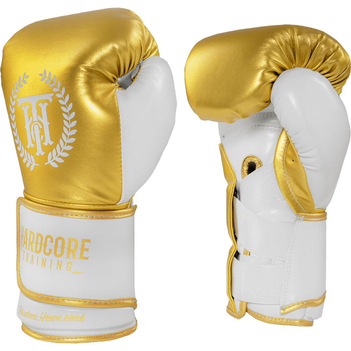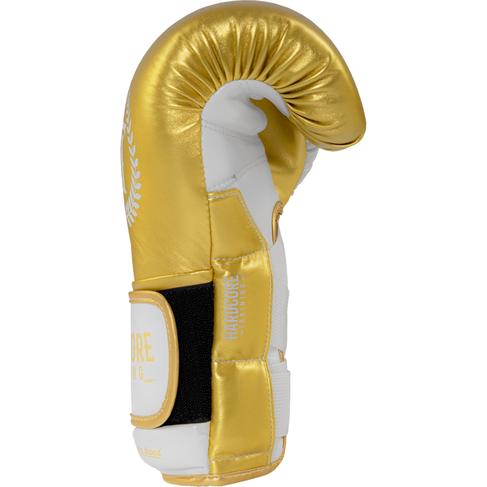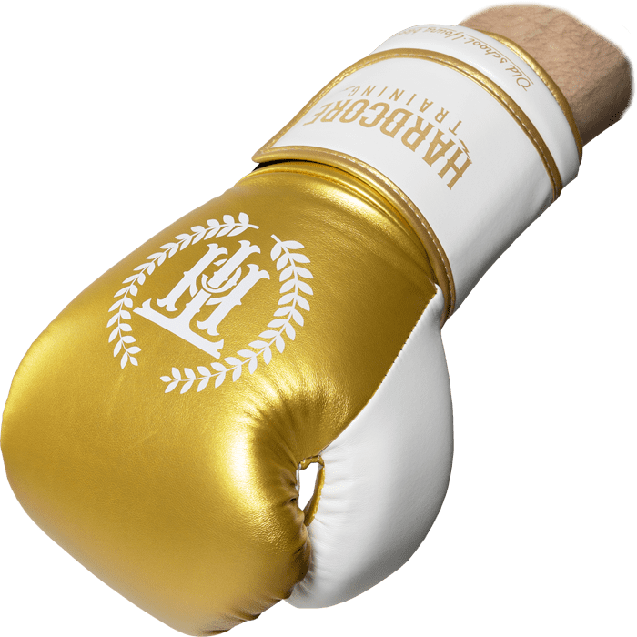 Боксерские перчатки Hardcore Training "Revolution Gold/White" подходят для различных видов единоборств, включая бокс, кикбоксинг, тайский бокс и другие.