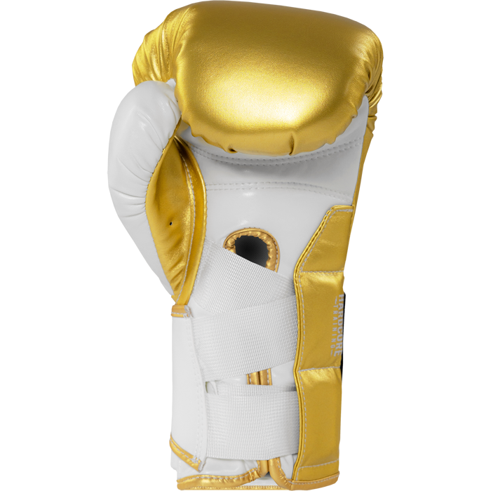 Дизайн перчаток выполнен в стильном и ярком сочетании золотого и белого цветов, что делает их заметными и привлекательными. Они подчеркнут вашу индивидуальность и добавят уверенности на ринге.