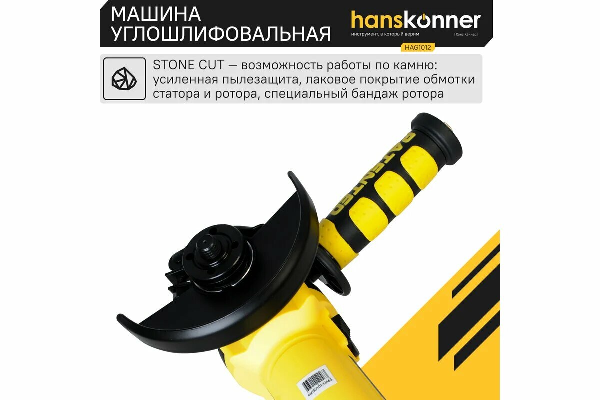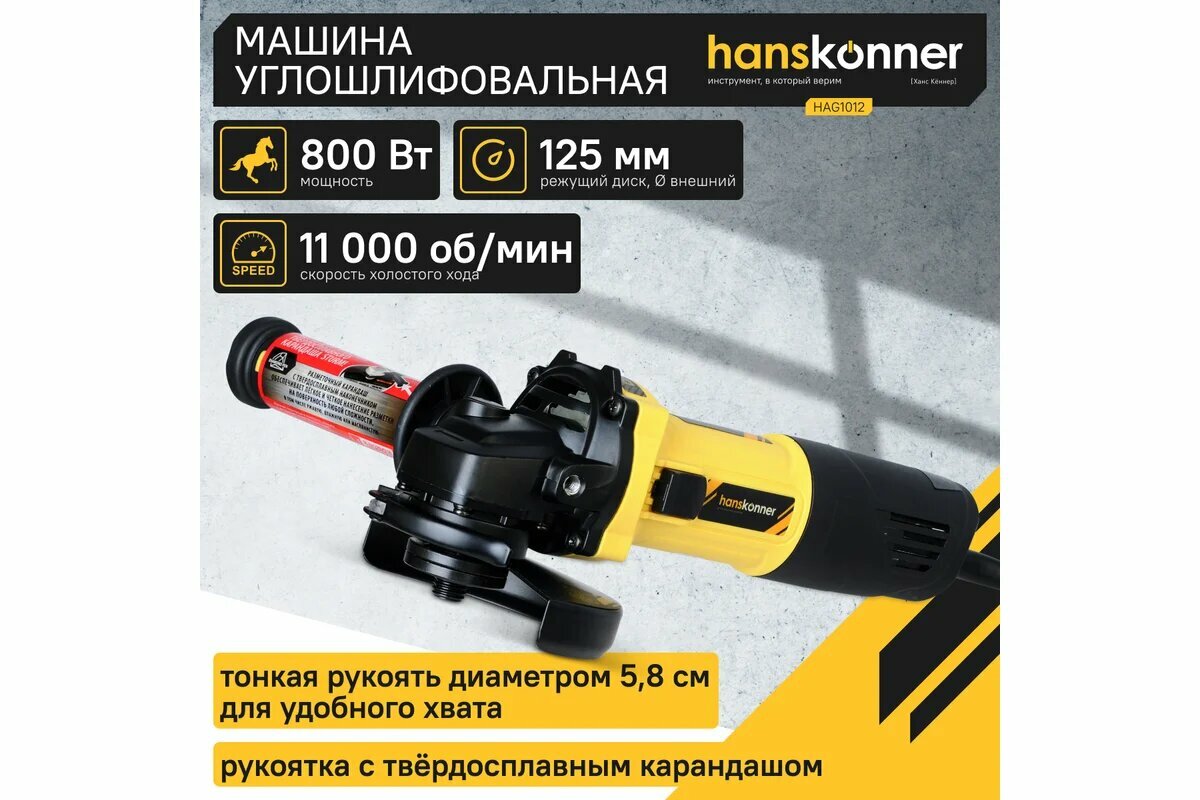 Болгарка Hanskonner HAG1012, 800 Вт, посадочный диаметр 22,2 мм, защитный кожух, 125 мм