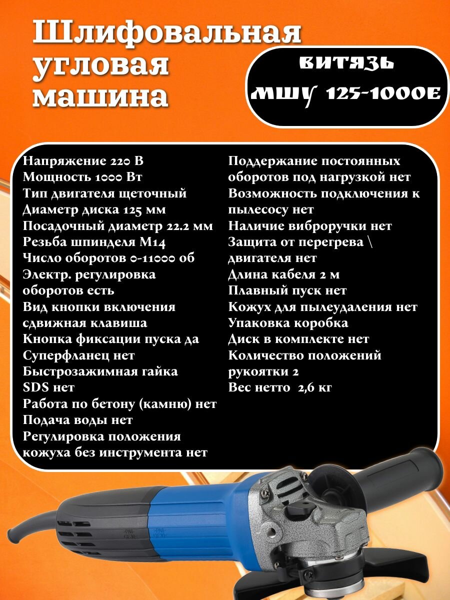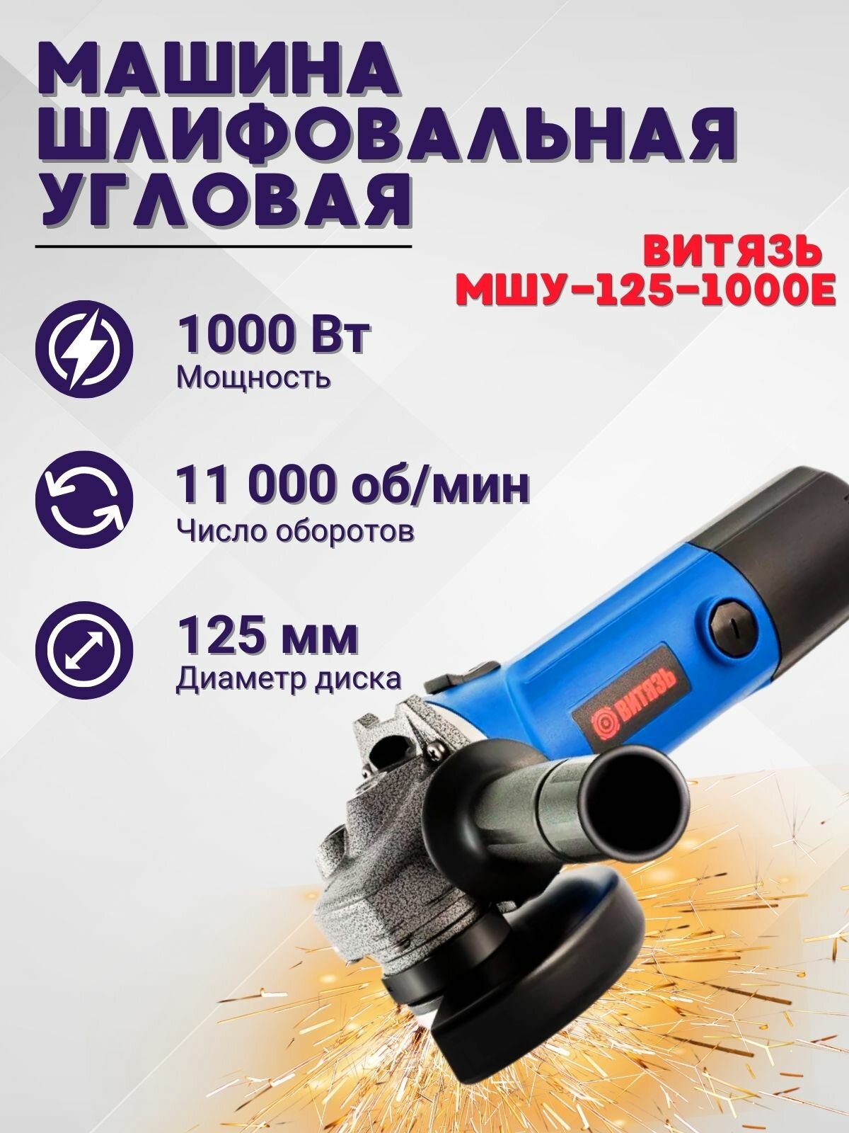 Болгарка Витязь МШУ-125-1000E, 1000 Вт, 125 мм, 11000 об/мин, с кожухом / Шлифовальная машина / УШМ с регулировкой оборотов: сравнение цен, характеристики, фото, актуальное наличие и цены.