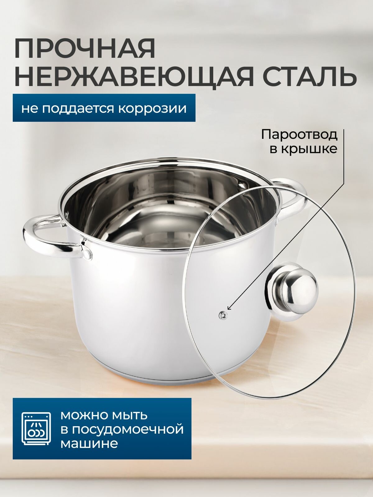 Кастрюля VETTA Орландо размером 24х20 см и объемом 9 л, со стеклянной крышкой с паровыпуском – это прекрасная помощница для приготовления первых блюд, варки гарниров и компотов. Изготовлена из высококачественной нержавеющей стали, имеет толстые стенки, устойчивые к деформации. Пятислойное капсульное дно обеспечивает равномерное распределение тепла, быстро нагревается и долго сохраняет температуру. Предусмотрена мерная шкала для замера точных объемов. Подходит для всех типов плит, включая индукционные. Легко моется, можно использовать в посудомоечной машине.