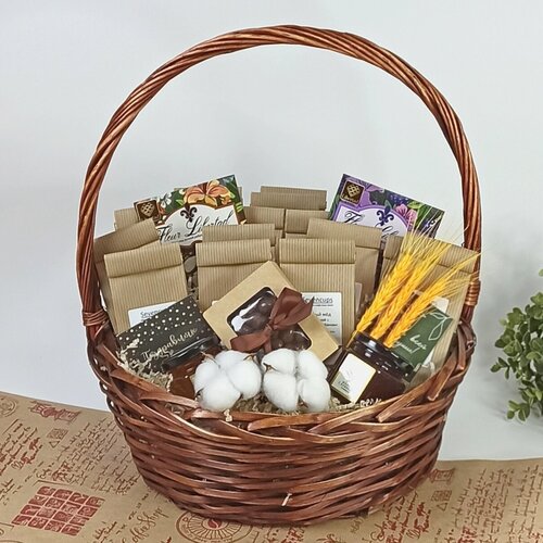 Примерные размеры корзины: диаметр 38-40 см, высота с бантом 38-45 см. Т. к. корзина ручной работы из натуральной лозы, ее размеры и оттенок могут немного варьировать. На каждом пакетике с чаем написан состав и рекомендации по завариванию.