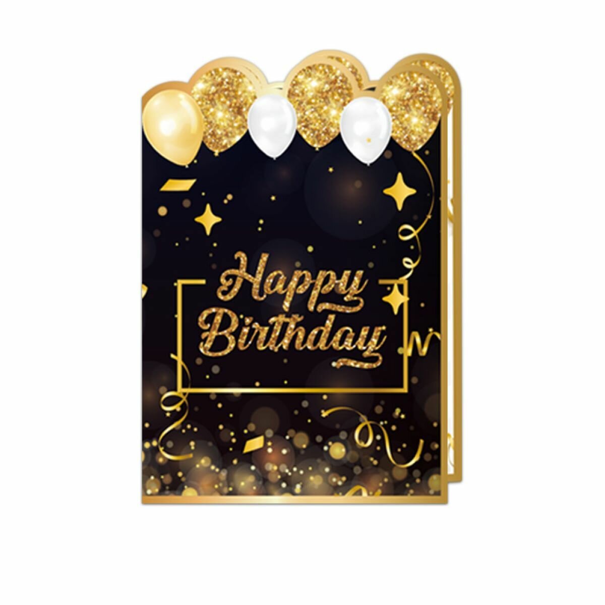 Открытка с надписью Happy Birthday изготовлена из качественного картона, ее дизайн в богато-помпезных цветах - черном и золотом с глиттером. Она замечательно подходит по случаю солидных юбилеев для людей старшего поколения, которые очень ценят подобные знаки внимания и потом бережно хранят их.