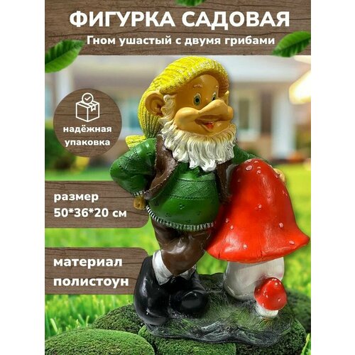 Купить Большая садовая фигурка «Гном ушастый с двумя грибами» декор для дачи, сада и огорода с доставкой по всей России.