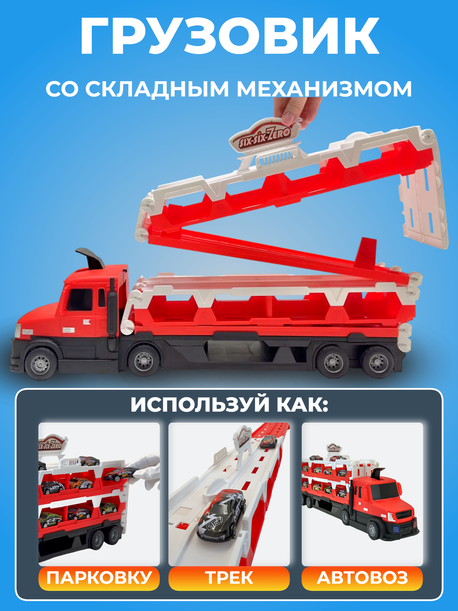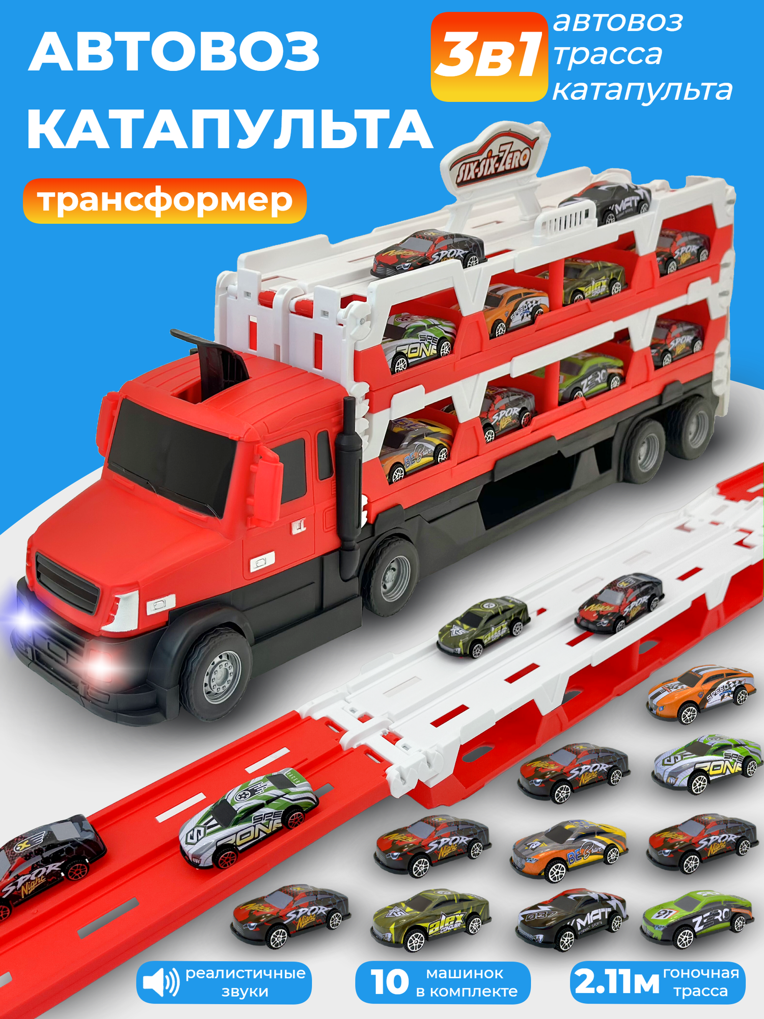 Купить Большой автовоз с металлическими машинками и катапультой, автотрек со звуком и светом, трейлер 51х22х12 см с доставкой по всей России.