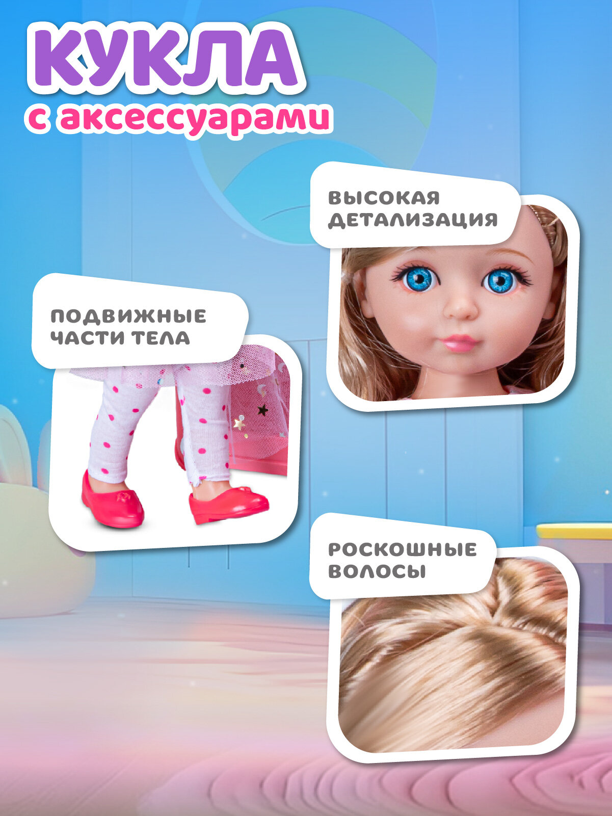 Большая кукла с аксессуарами подойдет для девочек от 3 лет и станет отличным подарком на день рождения, Новый год или другой праздник. Детский набор подарит ребёнку множество часов увлекательной игры, а также поможет развить навыки заботы и ухода, творческое мышление и мелкую моторику. Рост куклы – 30 см