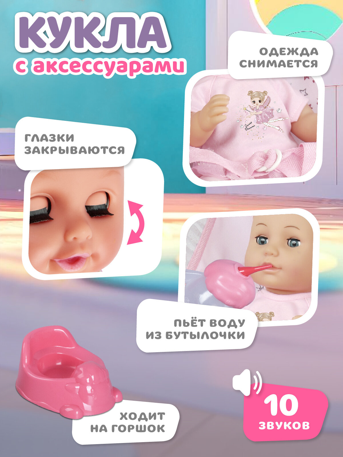 Кукла пьет воду из бутылочки и ходит на горшок.