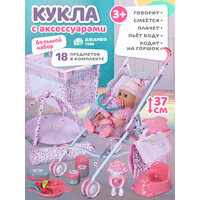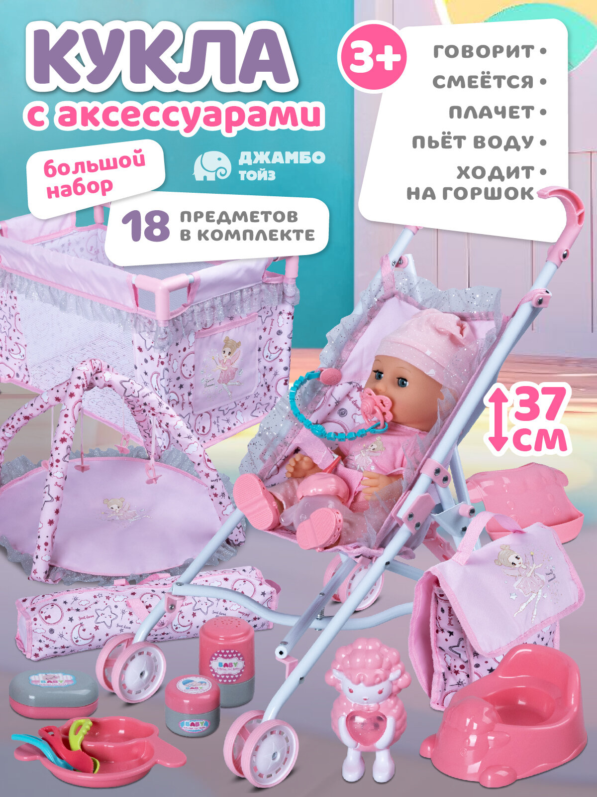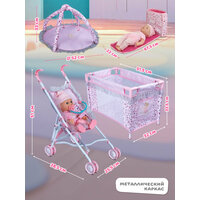 Игровой набор для девочек состоит из 18 предметов: манеж-кроватка, коляска-трость, сумка-коврик, развивающий коврик, горшок, бутылочка, передник, тарелочка, ложка и другие.