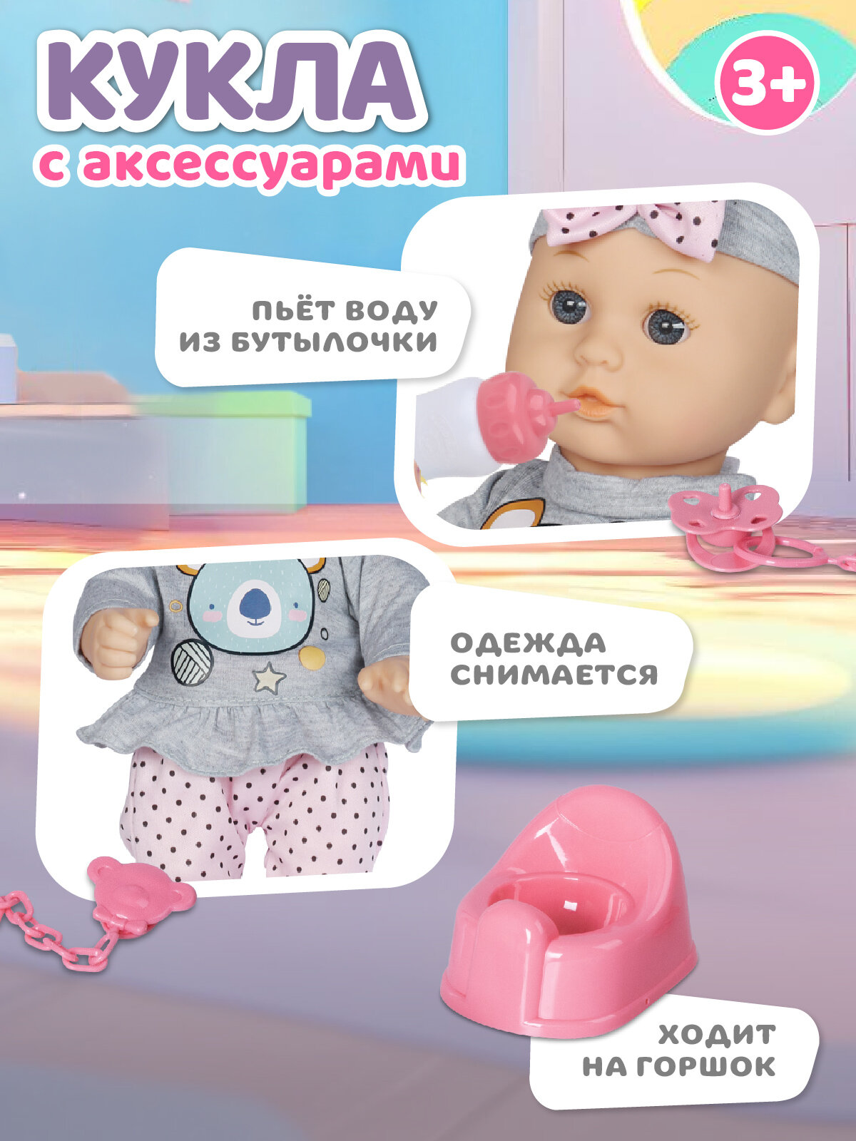 Кукла пьет воду из бутылочки и ходит на горшок.
