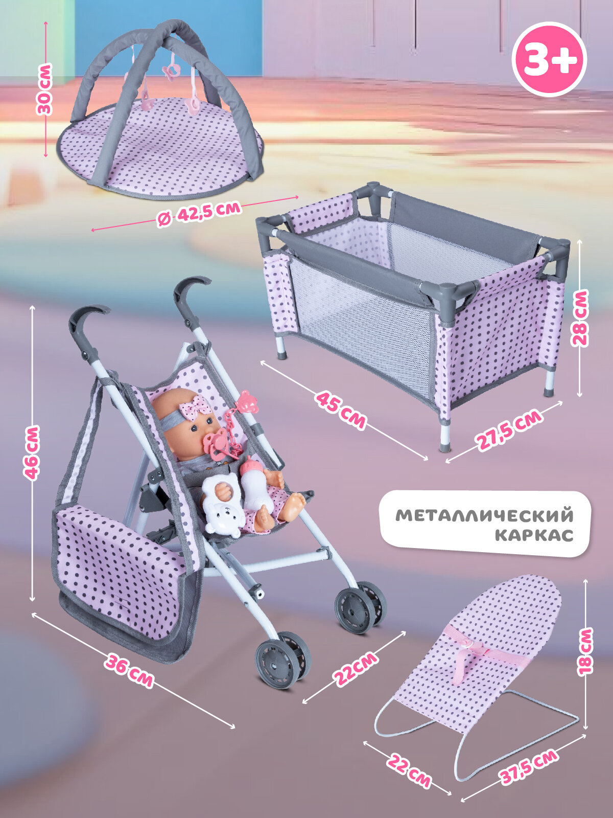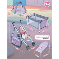 Игровой набор для девочек состоит из 17 предметов: манеж-кроватка, коляска-трость, сумки, развивающий коврик, горшок, бутылочка, шезлонг, тарелочка, ложка и другие.
