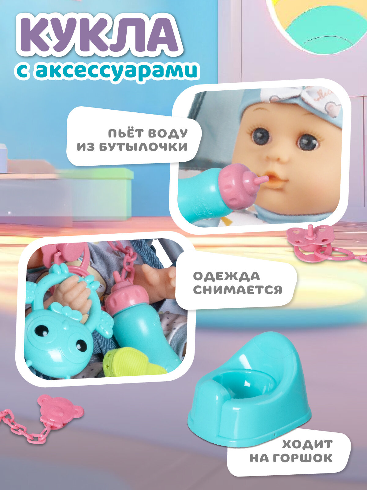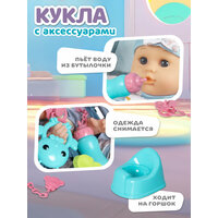 Кукла пьет воду из бутылочки и ходит на горшок.