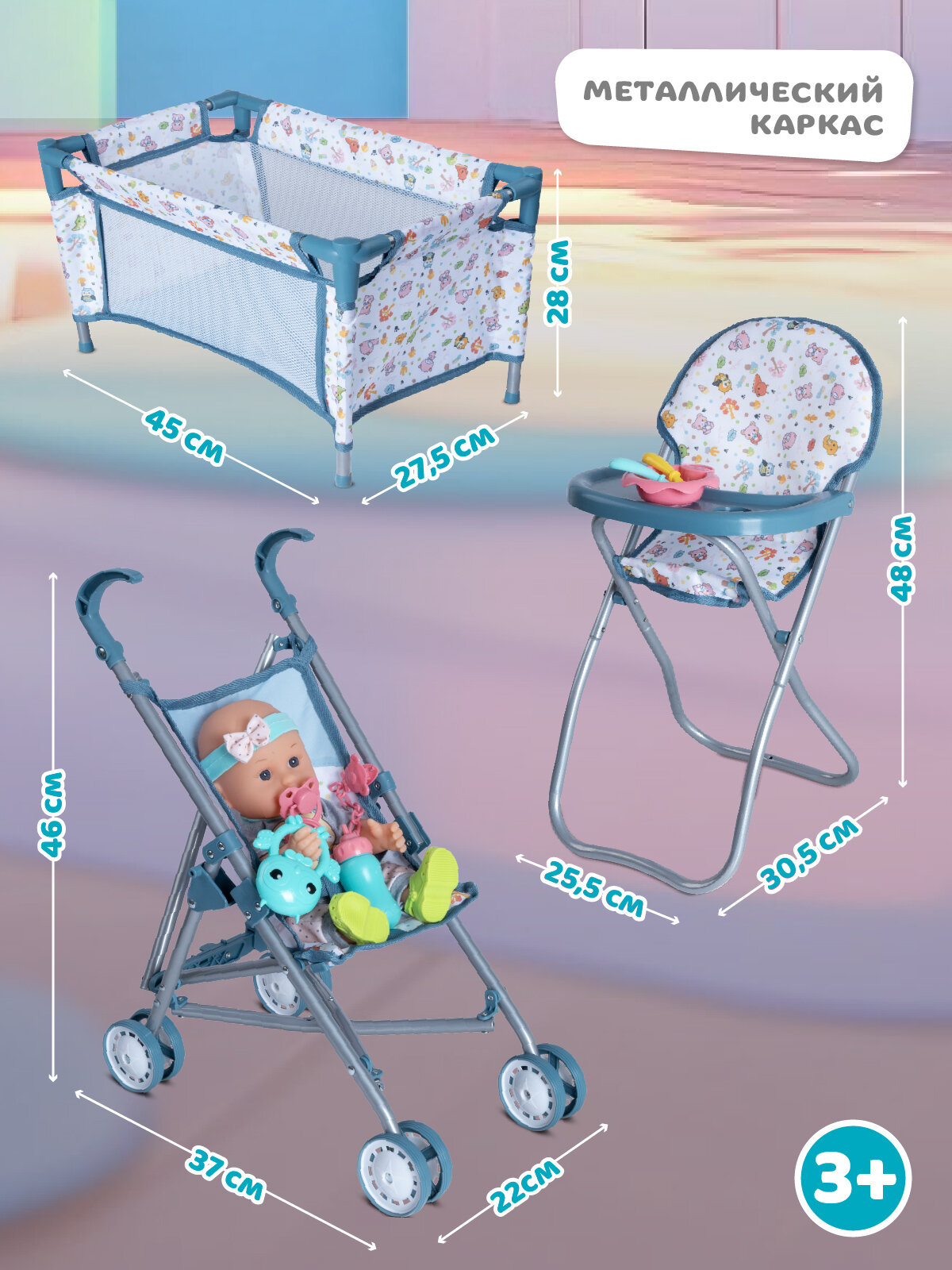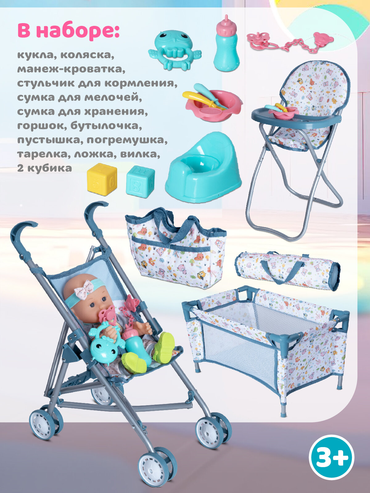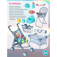 Игровой набор для девочек состоит из 15 предметов: манеж-кроватка, коляска-трость, сумки, стульчик для кормления, горшок, бутылочка, тарелочка, ложка, погремушка и другие.