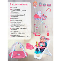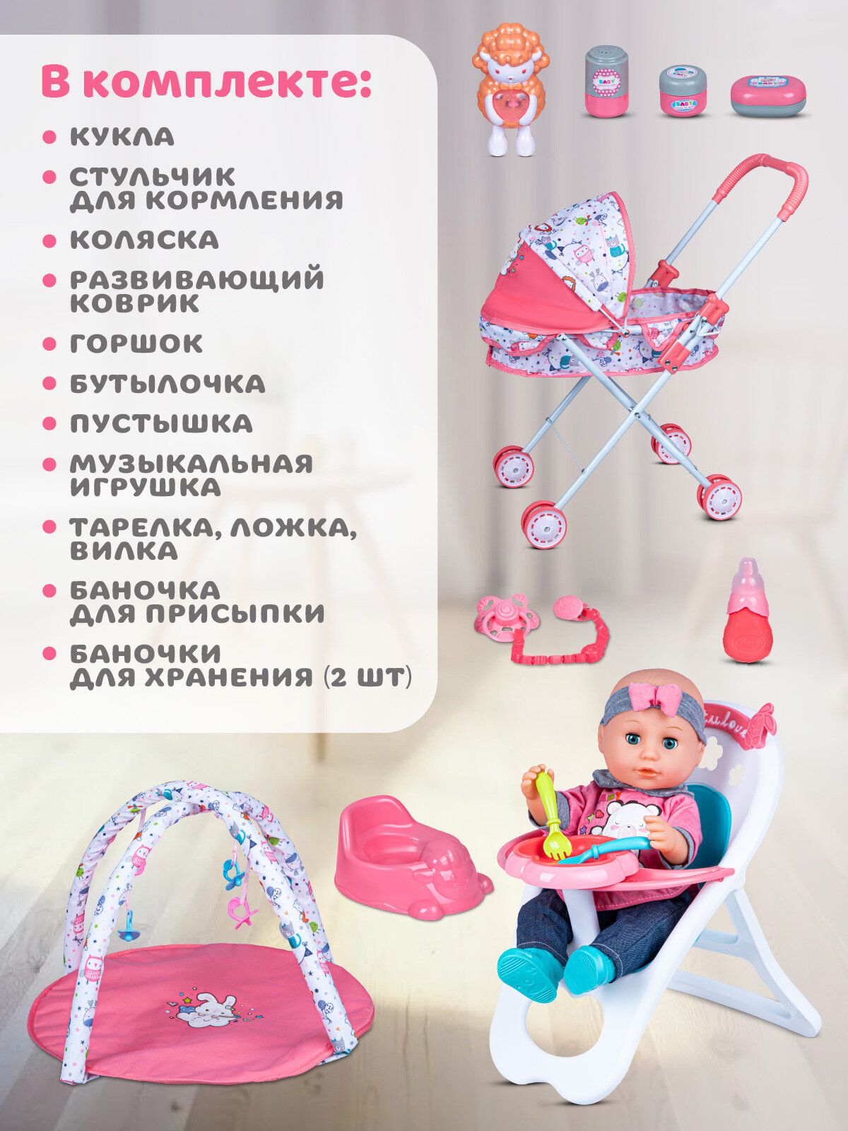 В комплекте: кукла, стульчик для кормления, коляска, развивающий коврик, горшок, бутылочка, пустышка, музыкальная игрушка, тарелка, ложка, вилка, баночка для присыпки и 2 баночки для хранения.