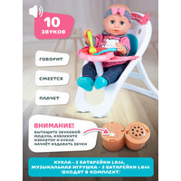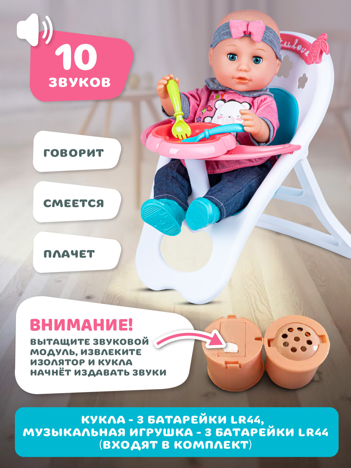 Батарейки: 3 батарейки LR44 для куклы и 3 батарейки LR44 для музыкальной игрушки (входят в комплект)