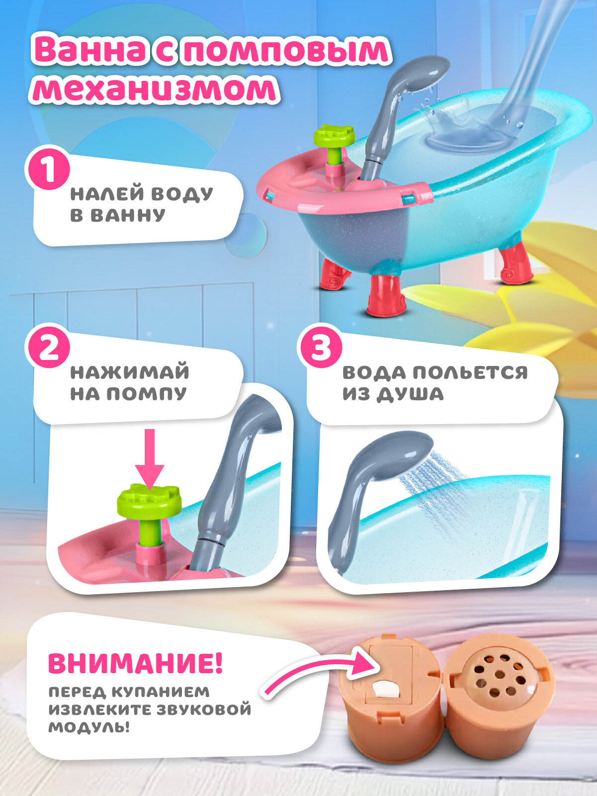 В комплекте с куклой идет одна коляска, ванночка и кроватка. Это позволяет малышам разыгрывать различные сценарии игры в дочки-матери, что способствует развитию социальных навыков и фантазии.