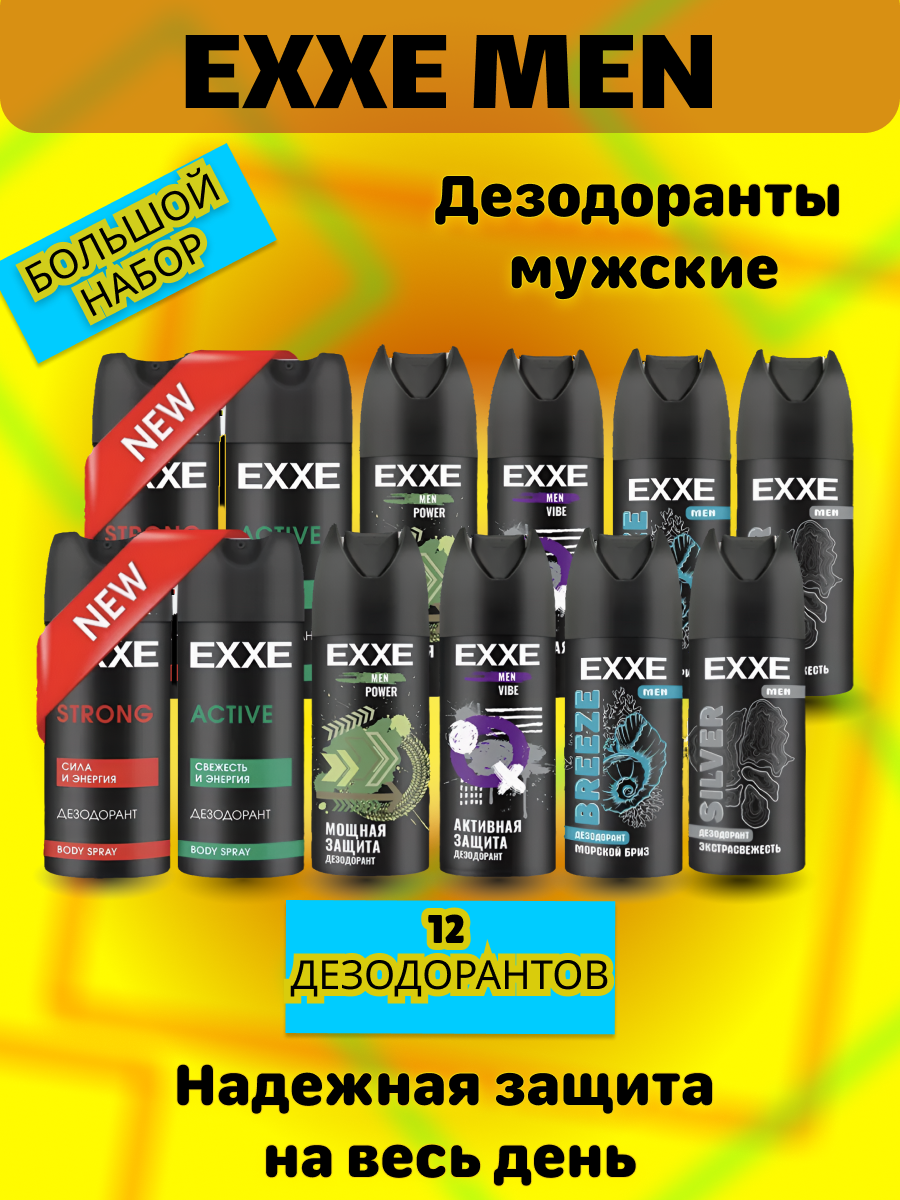Купить Большой Набор мужских дезодорантов Exxe Strong, Active, Vibe, Power, Silver, Breeze, спрей, 150мл, 12шт с доставкой по всей России. Большой Набор мужских дезодорантов Exxe Strong, Active, Vibe, Power, Silver, Breeze, спрей, 150мл, 12шт: сравнение цен, характеристики, фото, актуальное наличие и цены.