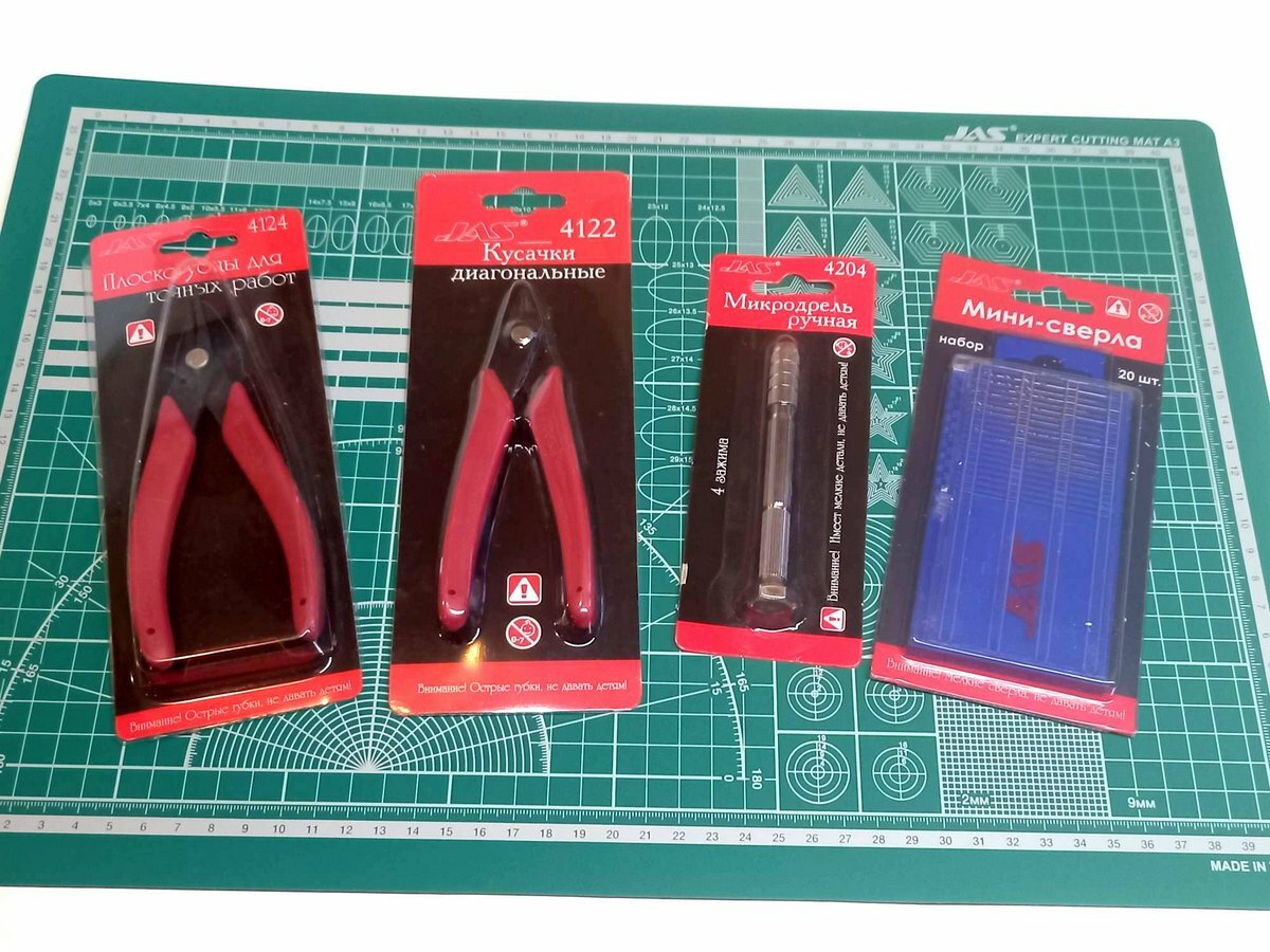 JAS3691 Набор кистей из синтетического волоса, 6 шт. ; JAS4026 Нож с цанговым зажимом, алюминиевая ручка + 3 запасных лезвия; JAS4124 Плоскогубцы для точных работ; JAS4122 Кусачки для пластика ; JAS4131 Зажим пластиковый, 25 мм, 4 шт; JAS4132 Зажим пластиковый, 38 мм - 2шт; JAS4141 Струбцина металлопластиковая, 120 мм; JAS4204 Микродрель ручная, 4 зажима; JAS4272 Мини-сверла, диаметр 0,3 - 1,6 мм, набор, 20 шт., HSS 4241, нитрид-титановое покрытие; JAS4351 Набор надфилей с ручками, алмазные, 10 шт., чехол; JAS4503 Коврик для резки, самовосстанавливающийся 3-х слойный, А3, 300 х 450мм; JAS4600 Держатель наждачной бумаги на липучке, 30x90 мм; JAS4616 Наждачная бумага на липучке, P80, P120, P180, 30x90 мм, 6 шт; JAS4617 Наждачная бумага на липучке, P240, P320, P400, 30x90 мм; JAS4618 Набор наждачной бумаги на липучке, P600, P800, P1000, P1500, 30x90 мм, 8 шт; JAS4821 Набор лезвий (пилка по пластику, длина 45 мм) к ножу с цанговым зажимом, 5 шт; JAS4823 Лезвие для ножей, 0.5х9х43 мм, 6 шт; JAS41100 Пинцет прямой, 120 мм