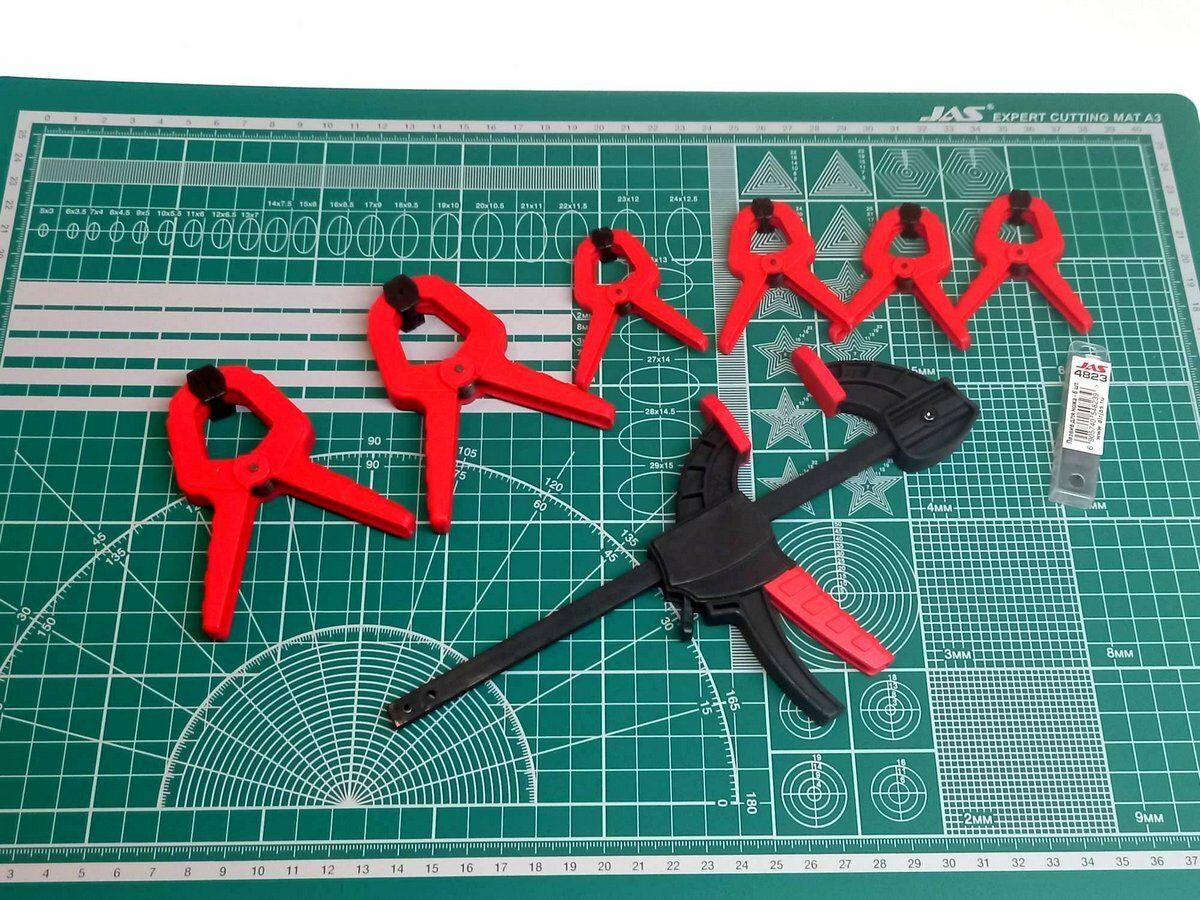 ДЛЯ ФИКСАЦИИ ДЕТАЛЕЙ: Струбцина металлопластиковая, механическая, с рычагом фиксации, для деталей до 120 мм 4 маленьких зажима (детали до 25 мм) и 2 средних (детали до 38 мм). Пинцет прямой 120 мм. Плоскогубцы для точных работ с длинными тонкими губками.