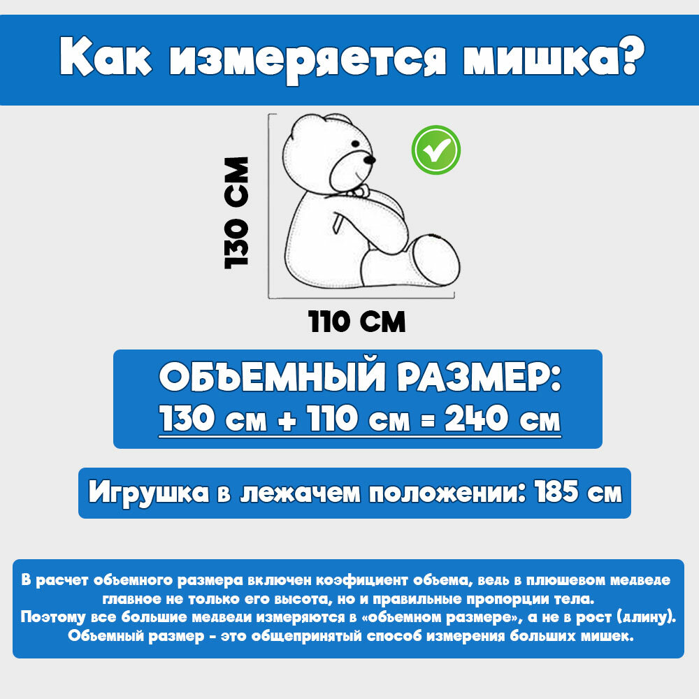 Внимание! Объемный размер мягкой игрушки медведя измеряется так: от головы до хвоста (по спине) - 130 см, от хвоста до кончиков лап - 110 см. Итого: 240 см.