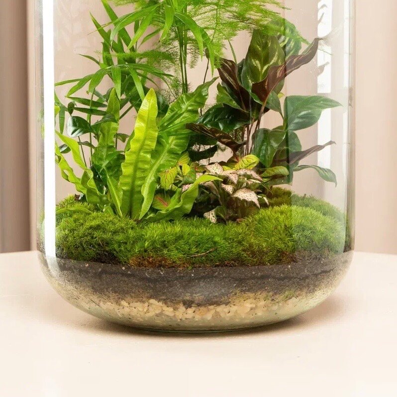 • Это живая экосистема, где циркулирует влага и происходит естественный обмен веществ. Внутри флорариума живут микроорганизмы, растения и мох, создавая баланс, который поддерживается самостоятельно. Экосистема живет своей жизнью, требуя минимального ухода.