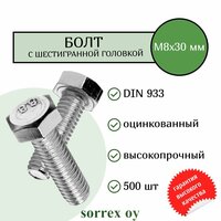 Купить Болт М8х30 мм с шестигранной головкой по DIN 933 с полной резьбой оцинкованный, класс прочности 8.8 (500 штук) Sorrex OY с доставкой по всей России.