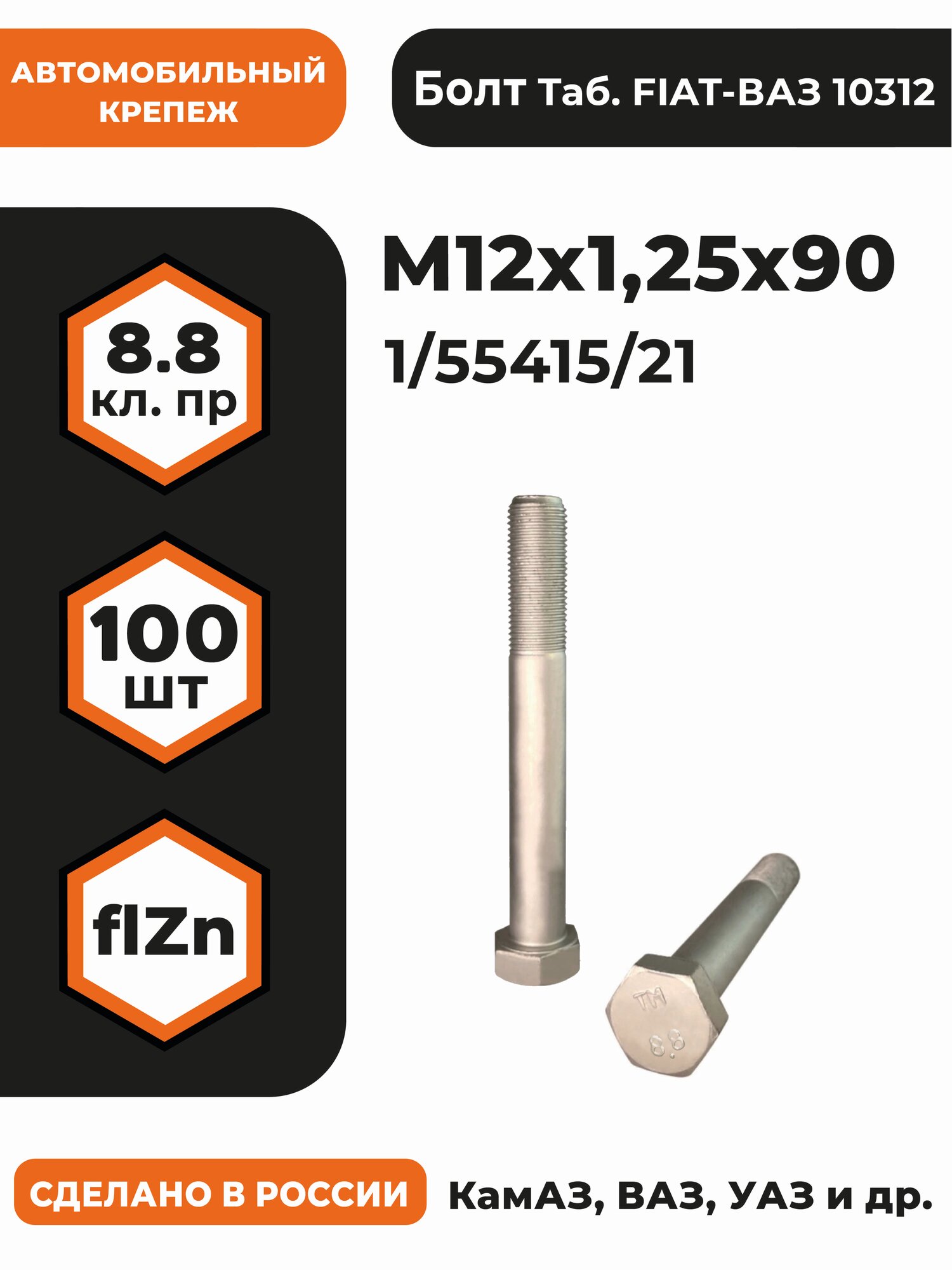 | Подробная комплектация | Болт с шестигранной головкой, высокопрочный, мелкий шагом резьбы. Стандарт: таблица FIAT-ВАЗ 10312. Диаметр резьбы: 12 мм. Шаг резьбы: 1,25 (мелкий). Длина болта: 30 мм. Длина резьбы: 30 мм. Размер "под ключ": 19 мм. Класс прочности: 8.8. Покрытие: цинк-ламель. В соответствии со стандартами, длина болта измеряется от опорной части головки до конца фаски, которой завершается его резьбовой стержень. |