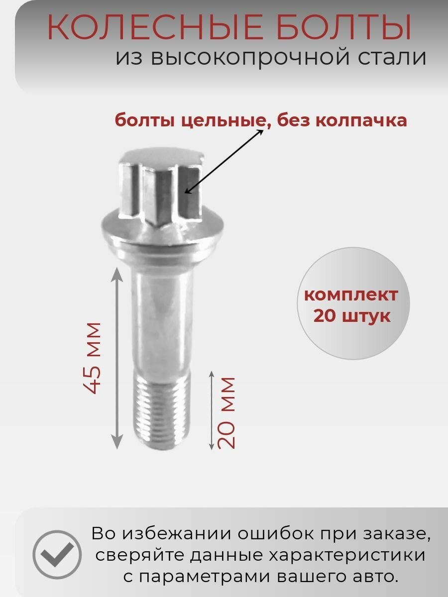 Колесные болты для крепления дисков автомобиля. Материал: высокопрочная сталь. Класс прочности: 10.9 (соответствует требованиям к колесному крепежу мировых производителей автомобилей)- Диаметр и шаг резьбы : 14х1.5- Длина резьбы: 20 мм -Длина стержня от сферы 45 мм- Прижимная поверхность: сфера (сфера R12)- Покрытие: цинк- Ключ: 17 мм в виде ромашки- Комплект: 20 шт. Внимание! Во избежании ошибок при заказе, сверяйте данные свойства с параметрами вашего авто. Обращайте внимание на диаметр, шаг, длину резьбы и прижимную поверхность.