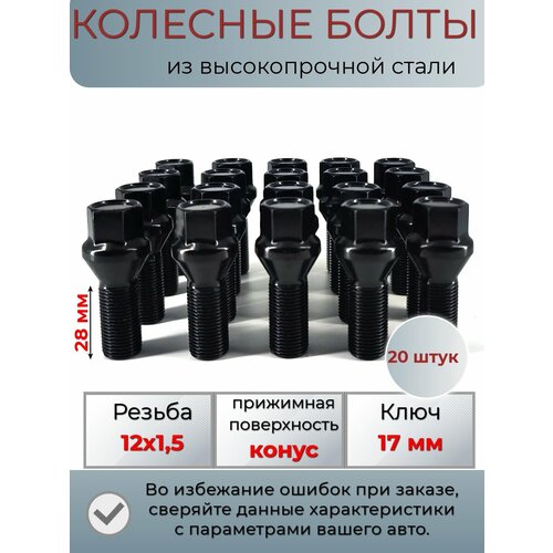 Колесные болты для крепления дисков автомобиля. Материал: высокопрочная сталь. Класс прочности: 10.9 (соответствует требованиям к колесному крепежу мировых производителей автомобилей)- Резьба: 12х1.5- Длина резьбы 28 мм: - Прижимная поверхность: конус- Покрытие: черное- Ключ: 17 мм- Комплект: 20 шт.-Угол конуса: 60 градусов. Внимание! Во избежании ошибок при заказе, сверяйте данные свойства с параметрами вашего авто. Обращайте внимание на диаметр, шаг и длину резьбы. болты колесные
