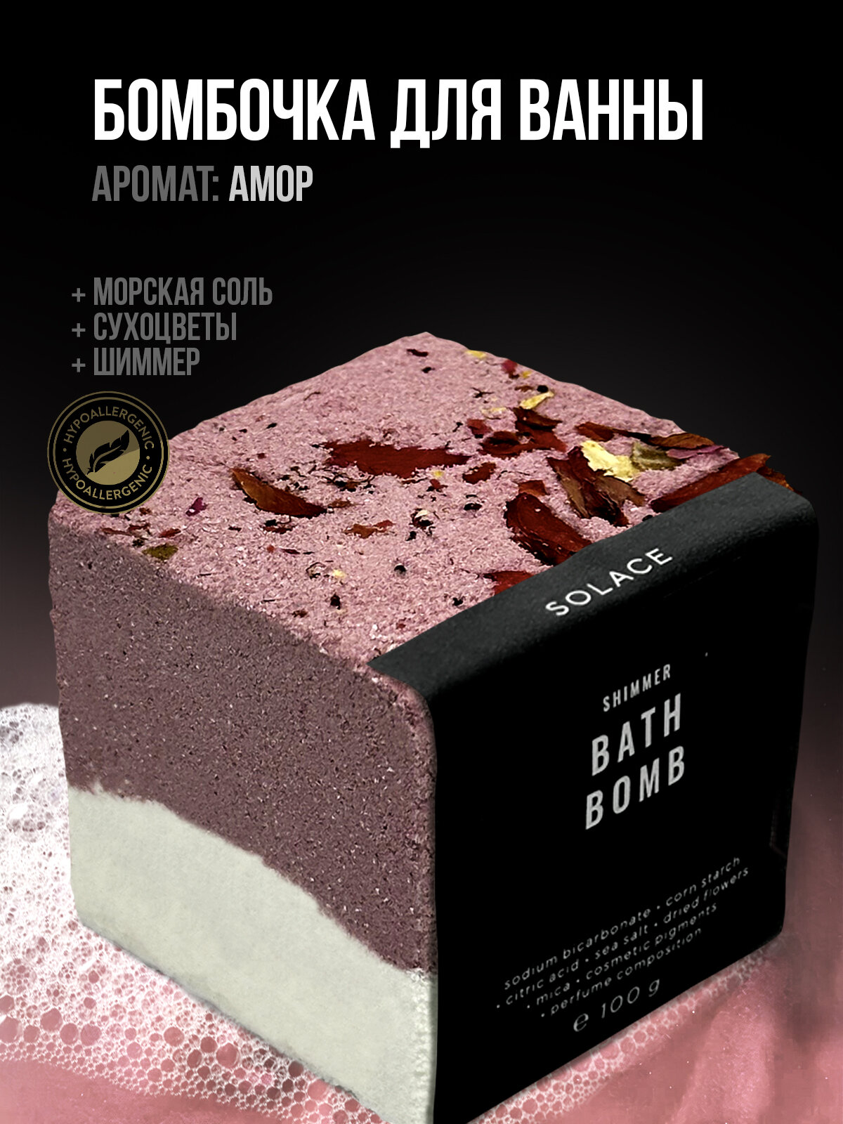 Бомбочка для ванны Solace с ароматом Роза ручной работы с морской солью, шиммером и сухоцветами (розовый / белый): сравнение цен, характеристики, фото, актуальное наличие и цены.