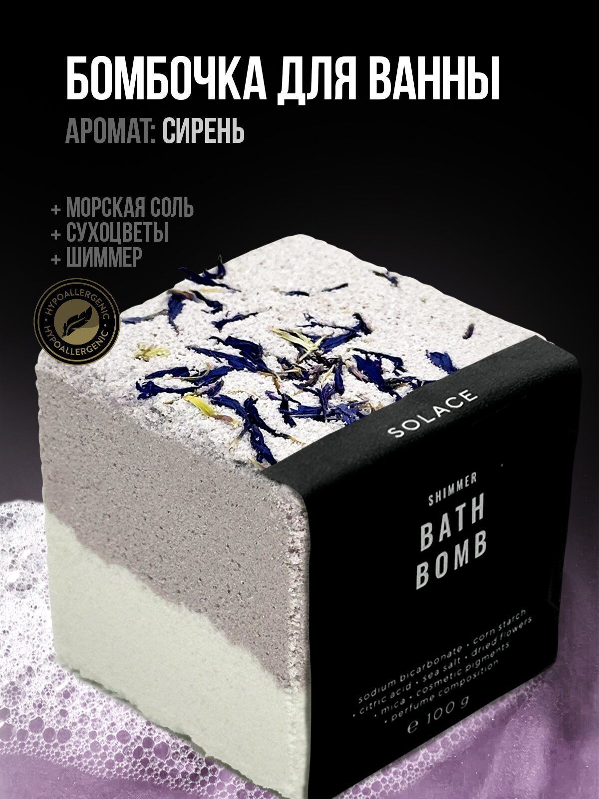 Бомбочка для ванны Solace с ароматом Сирень ручной работы с морской солью, шиммером и сухоцветами (сиреневый / белый): сравнение цен, характеристики, фото, актуальное наличие и цены.
